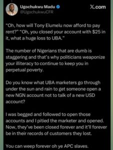 Nigerian-born health communication specialist, Ugochukwu Madu, has reportedly closed all his accounts with United Bank for Africa (UBA) following recent comments by the bank’s chairman, Tony Elumelu, in support of President Bola Ahmed Tinubu’s economic reforms.