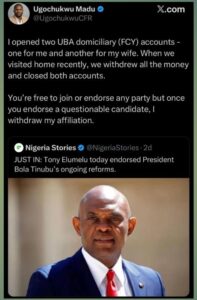 Madu announced his decision shortly after Elumelu publicly endorsed the President’s ongoing policy measures, sparking mixed reactions online.